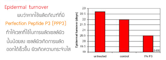 ดังนั้น Perfection Peptide P3 (PPP3) จึงเป็นการเลียนแบบกระบวนการผลัดเซลล์ผิวตามธรรมชาติ(Biomimetic peeling) เหมือนกับผิวของผู้ที่เยาว์วัยเป็นการลด turnover time ของ epidermis ผิวจึงเนียนและกระจ่างใสลดริว้รอยเล็กๆและปรับให้สีผิวดูเสมอกันและยังช่วยกระตุ้นการสร้างเซลล์ผิวใหม่อีกด้วย